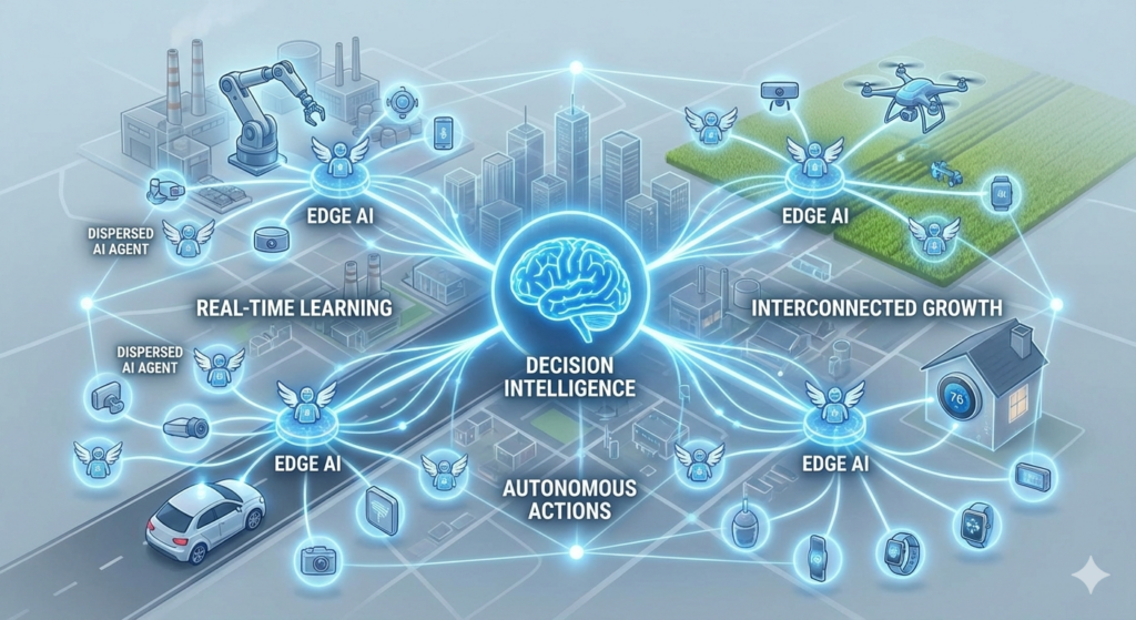 This is where a new constellation of technologies and ideas begins to emerge, still lacking a single, widely accepted label, but already reshaping how digital systems are conceived. Decision intelligence, Edge AI, and what are often referred to as agentic systems are not independent trends. They are expressions of the same underlying movement. A movement where intelligence no longer merely produces insight, but increasingly participates in action.